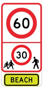 You’re driving along a beach where this sign is displayed. There are people on the beach up ahead. What is the speed limit?